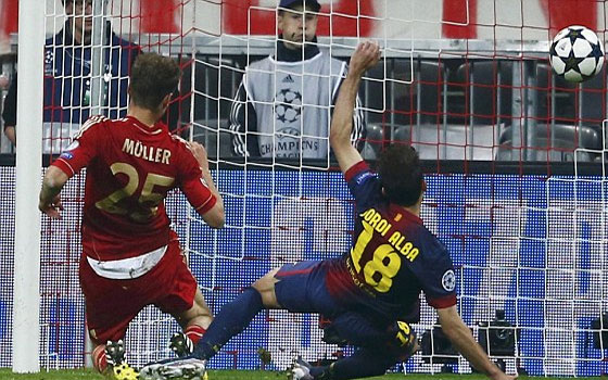 مولر الحفل البافاري بتسجيله هدفين، في حين أتم العمل الألماني العملاق ماريو جوميز والجناح الهولندي الطائر أريين روبن.ويلتقي الفريقان في جولة الإياب على أرض كامب نو يوم الأربعاء المقبل.. لكن برشلونة يحتاج إلى معجزة كتالونية لقنص بطاقة التأهل.رغم إصابة توني كروز، وغياب ماريو ماندزوكيتش ودانيل فان بويتن، ظهر بايرن ميونيخ بقوة غاشمة في مواجهة ضيفه الإسباني.برشلونة في المقابل كان شبحا رغم اشتراك ليونيل ميسي متحاملا على إصابته مع السحرة أندريس إنيستا وشابي هرنانديز وباقي الكتيبة الكتالونية.فمنذ الدقيقة الأولى كانت الهيمنة لبايرن، وكاد الفريق صاحب الأرض أن يتقدم بهدف لأريين روبن، لكن الهولندي سدد في جسد الحارس فيكتور فالديز.وعموما لم يتأخر التقدم البافاري، إذ سجل توماس مولر الهدف الأول من متابعة للعبة ألمانية هوائية اصطادها اللاعب صاحب لقب "اكتشاف مونديال 2010".وظهر برشلونة بمستوى كارثي في ألعاب الهواء مع وجود مارك بارترا المدافع الشاب بجوار جيرارد بيكي في غياب المصابين كارليس بويول وخافيير ماسكيرانو والموقوف أدريانو.كل كرة هوائية كانت من نصيب بايرن ميونيخ، وهو ما منح ماريو جوميز الهدف الثاني للفريق البافاري.كما حاول برشلونة الاستفاقة بلعب كرات قصيرة للاستحواذ على الكرة وإبعاد بايرن عن منطقة الجزاء الإسبانية.